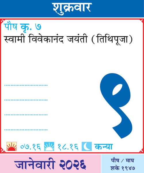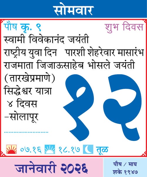 January 12, 2026Monday– Swami Vivekananda Jayanti / National Youth Day / Parsi Shehrevar Month Begins / Rajmata Jijabai Bhosale Jayanti (as per date) / Siddheshwar Yatra – Solapur (4 days)