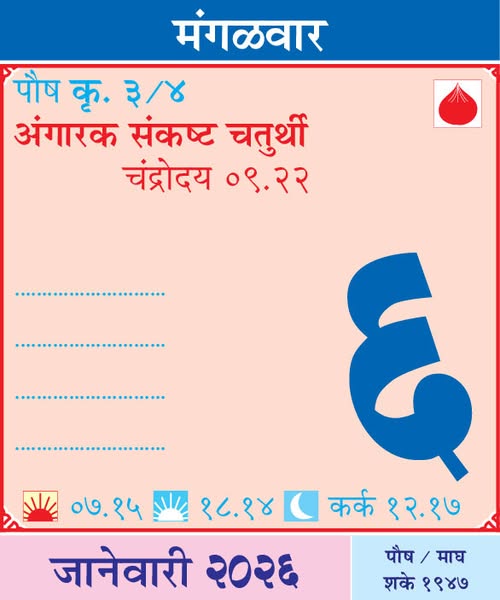 January 6, 2026Tuesday– Angarak Sankashti Chaturthi, Moonrise 08:53 / Tekdi Ganpati Yatra – Nagpur / Chandrabhagamata Yatrotsav – Kumbhargaon