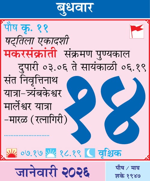 January 14, 2026Wednesday– Shat-tila Ekadashi / Makar Sankranti Transition Auspicious Time | 03:06 PM to 05:50 PM / Sant Nivrutthinath / Yatra –
