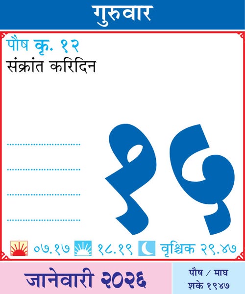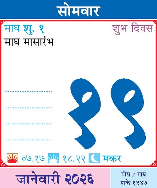 January 19, 2026Monday– Beginning of Magha Month / Kalavati Devi Punyatithi – Belgaum / Shri Chintamani Yatra – Kalamb (Yavatmal)