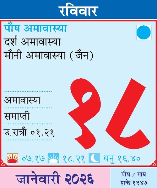 January 18, 2026Sunday– Mauni Amavasya (Jain) / Baijabai Yatra – Mundgaon (Akola) / Kejaji Maharaj Festival – Ghorad (Wardha) / Darsh Amavasya /