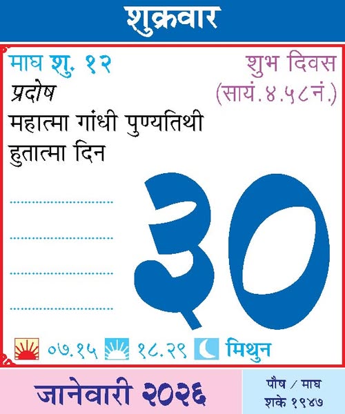 January 30, 2026Friday– Pradosh / Mahatma Gandhi Punyatithi / Hutatma din